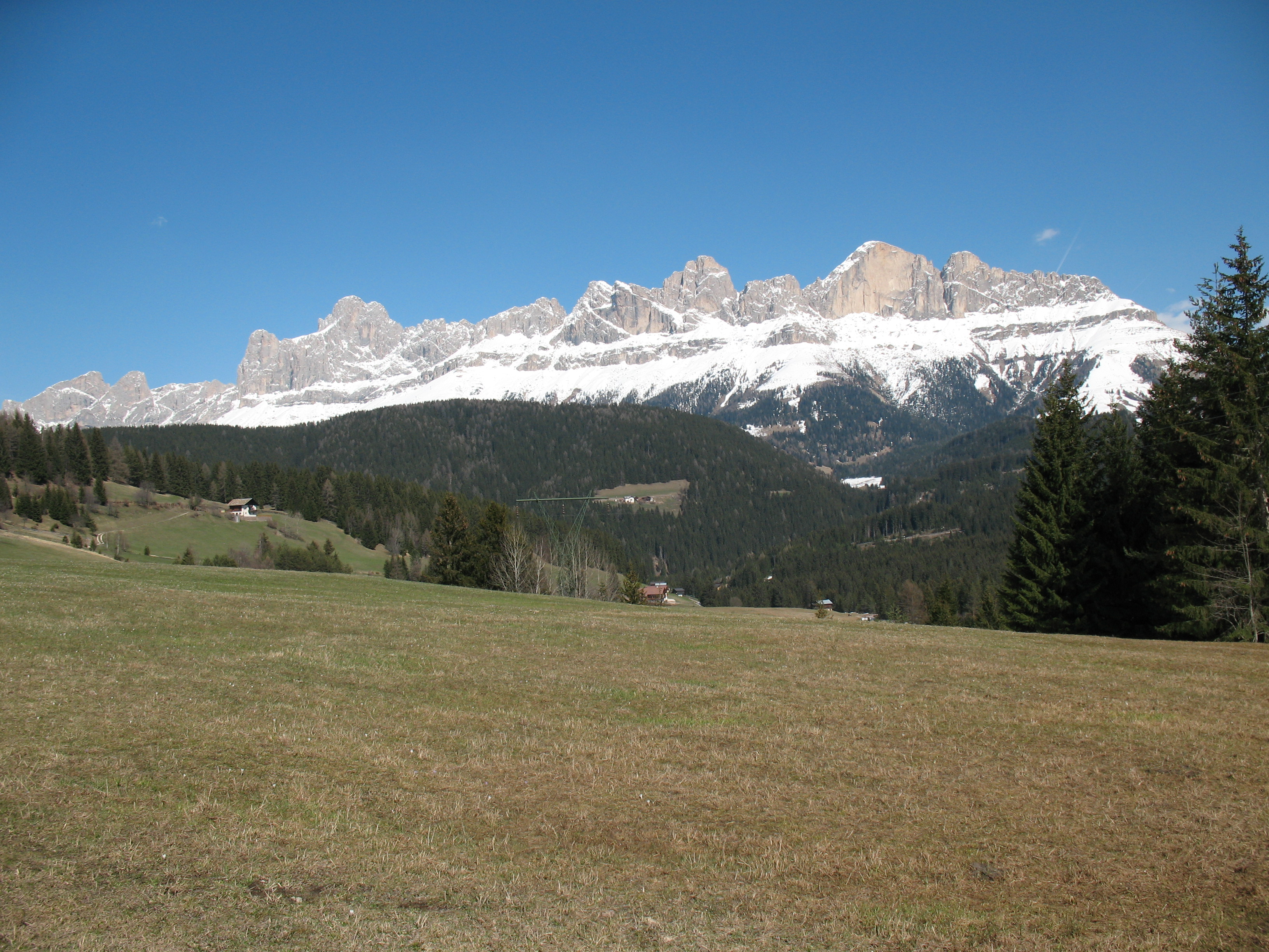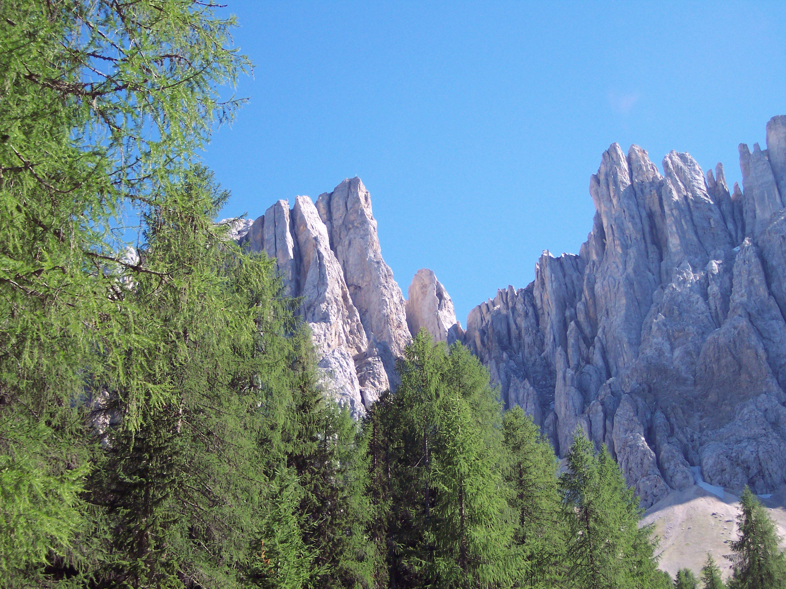 and on the 'core' of Catinaccio (Gartl). From left to right you see the Stabeler and Delago Towers, while the third one (Winkler) should be on the left and is out of the picture; completely on the right you find the Croda di Re Laurino and the terrible Passo di Re Laurino, while the Rifugio Passo Santner is far between the towers.
